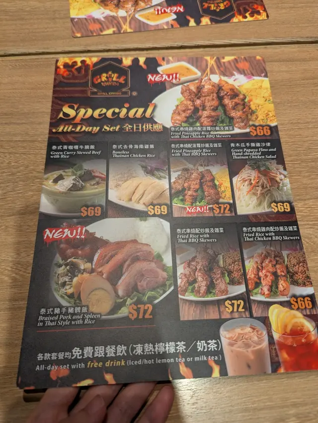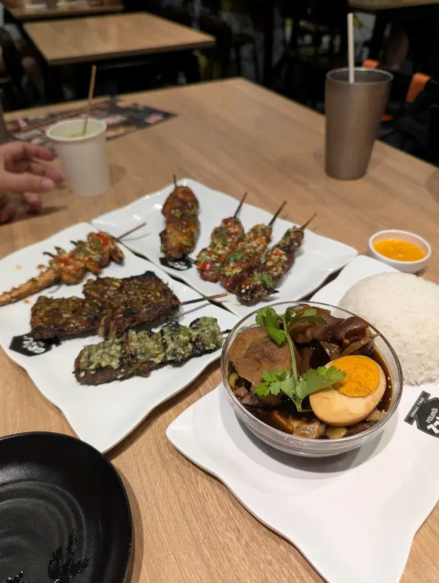 全天供應, 前者炒飯以醬油微辣好入味, 配左豬牛雞串燒仲包野飲.