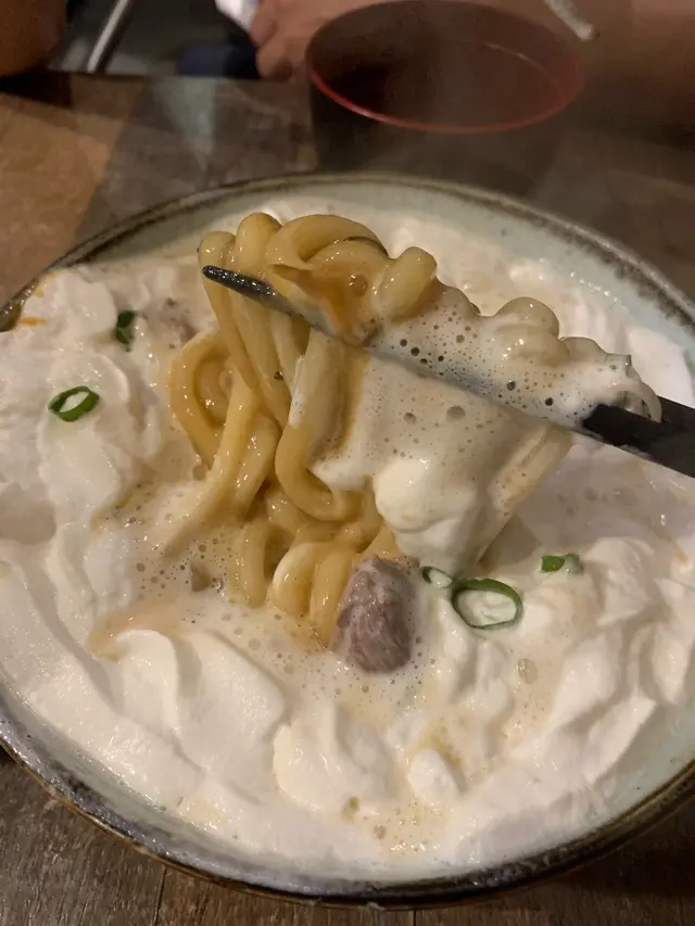 佢先上左個忌廉烏冬,成碗麵就係被一層忌廉覆蓋住!一夾開,就係咖哩烏冬。