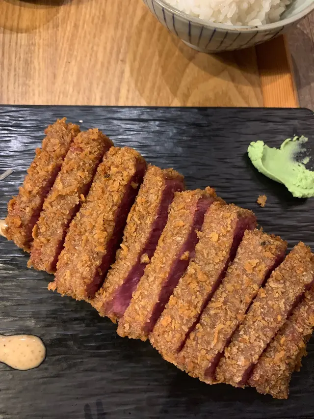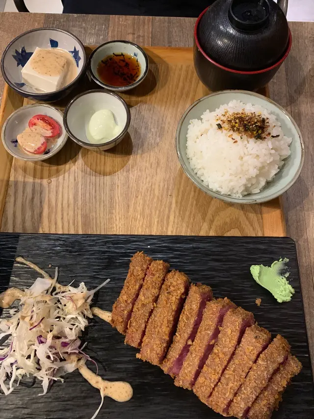 之後就係吉列牛定食,有一碗面豉湯,一小份胡麻豆腐,一粒車厘茄做前菜,一碗飯,有兩款醬汁點個牛,一個係甜甜地嘅燒汁,一個係有少少wasabi味嘅沙津醬。