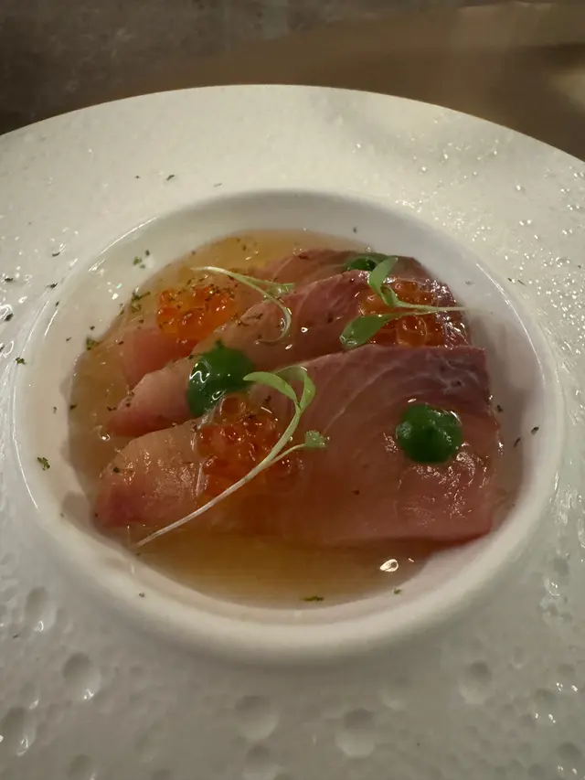 當熱騰騰的麵包端上桌時,第一口就讓人驚艷。這份好味道不僅來自麵包本身,還有那特別的醬料。雖然我已經忘了醬料的具體名字,但那種濃郁的風味,至今難以忘懷。接下來的頭盤——烏賊,鮮味十足,彈牙又細膩。而最讓我驚喜的,當屬主菜的和牛。牛肉的香氣濃郁,肉質入口即溶,肉汁在舌尖綻放,滑入喉間,令人回味無窮。雖然我不是專業的食評人,但我能清楚感受到廚師對料理的用心與誠意。