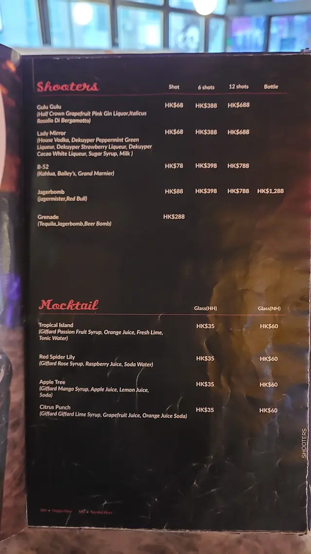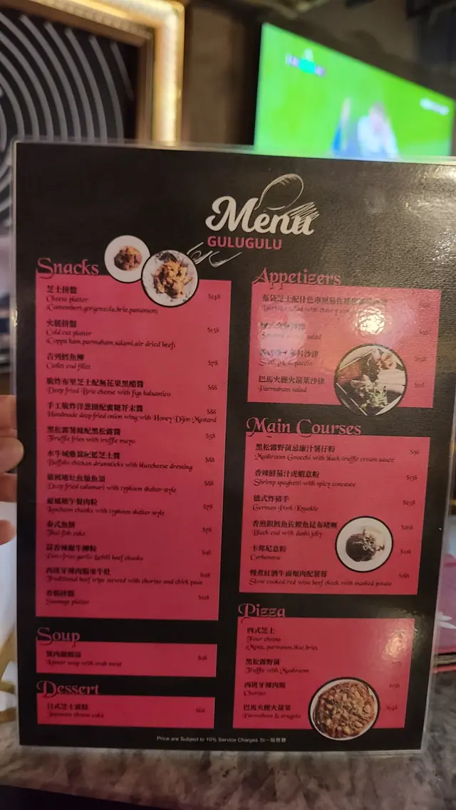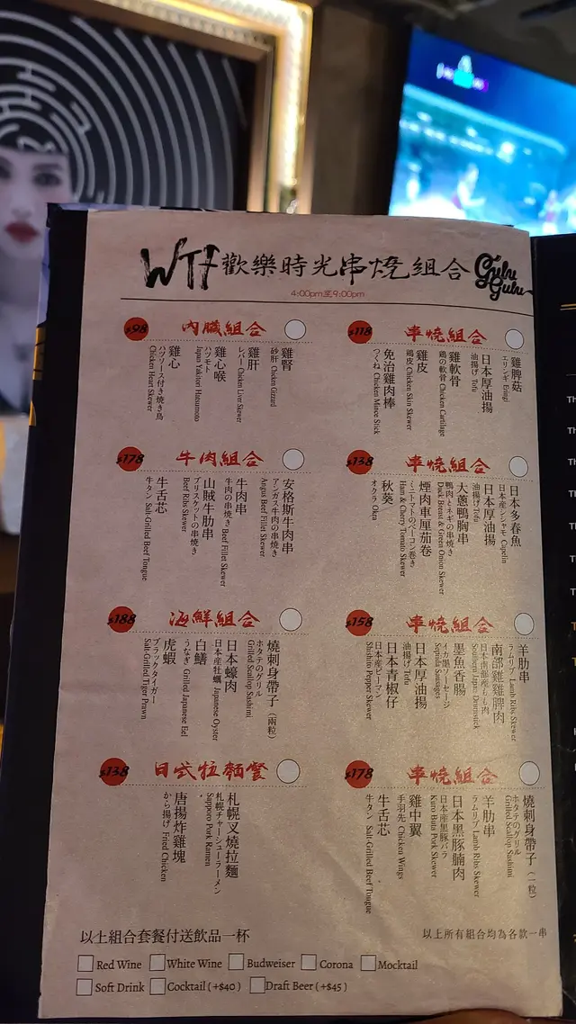 餐牌:小食,主食,Pizza,前菜,湯,甜品,多款串燒,串燒組合,啤酒,鷄尾酒,其他酒類