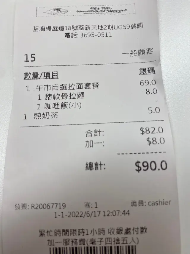 有個69蚊既LUNCH SET, 一款拉面+一款小食, 諗住都幾抵下, 就叫左個咖哩飯+豬軟骨拉面, 再加5蚊叫杯奶茶。首先上既係咖哩飯(好合理, 就咁裝D飯再林D咖哩汁) 味道還算不錯, 咖哩唔算辣, 不過都有咖哩味, 我會比中上既分數。