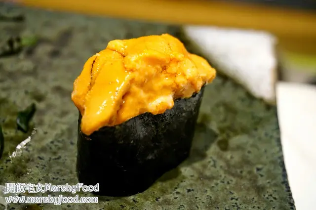 在香港吃海膽越來越普遍, 價格越來越大眾化, 質素亦越來越參差. 這裡用的是來自北海道利尻島產的海膽, 滿滿的堆在軍艦上成了一個黃金山, 再輕輕抹點醬油, 什麼都不用沾巳可入口. 豪邁一點, 整件''啪''入口, 那份海膽的鮮甜甘香真是教人吃得感動, 加上香脆的紫菜, 這件海膽壽司絕對是完美的演繹.