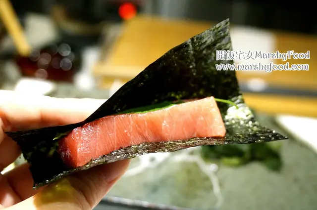 不過相比起大拖羅, 其實宅女個人更喜愛中拖羅, 沒有前者太豐厚的油脂, 但一樣甘香一樣鮮味, 連壽司飯也不要, 索性只包著紫菜, 加丁點青檸汁和紫蘇葉就入口, 味道絕不會搶去拖羅的鮮但又能令味道更豐富, 啖啖都是享受.