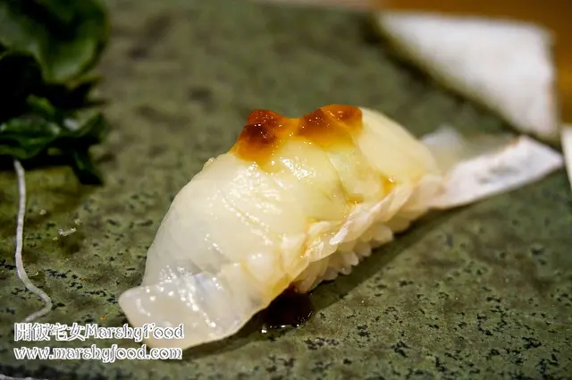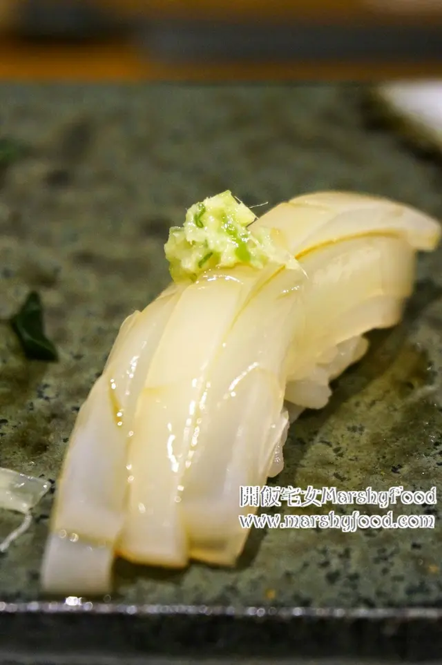 接下來聽到是墨魚壽司, 心想剛才上來的一直那麼精彩, 怎麼這個只是普通的墨魚? 但當師傅把壽司奉上眼前時, 便知道剛剛的想法是錯的了. 這裡的墨魚跟坊間的完全不一樣, 質地半透明, 輕輕抹點醬油馬上令墨魚更添多一份潤澤亮麗. 大膽的把香茅跟薑蔥作調味, 吃起來跟墨魚有著奇妙的火花, 味道有趣.