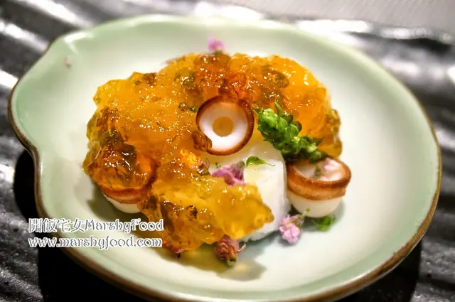 未上魚類刺身, 先來個八爪魚熱熱身. 切成顆粒的八爪魚上鋪滿了用蘋果醋製成的啫喱, 再加上點點柚子胡椒和紫蘇葉花, 吃起來除了有著八爪魚的鮮甜更有著輕微的辛辣, 還好配上清爽的蘋果醋啫喱, 酸辣鮮香集於一身, 味道果然非常豐富, 脾胃更進一步地打開, 此刻有點想跟師傅說句越來越肚餓了!!