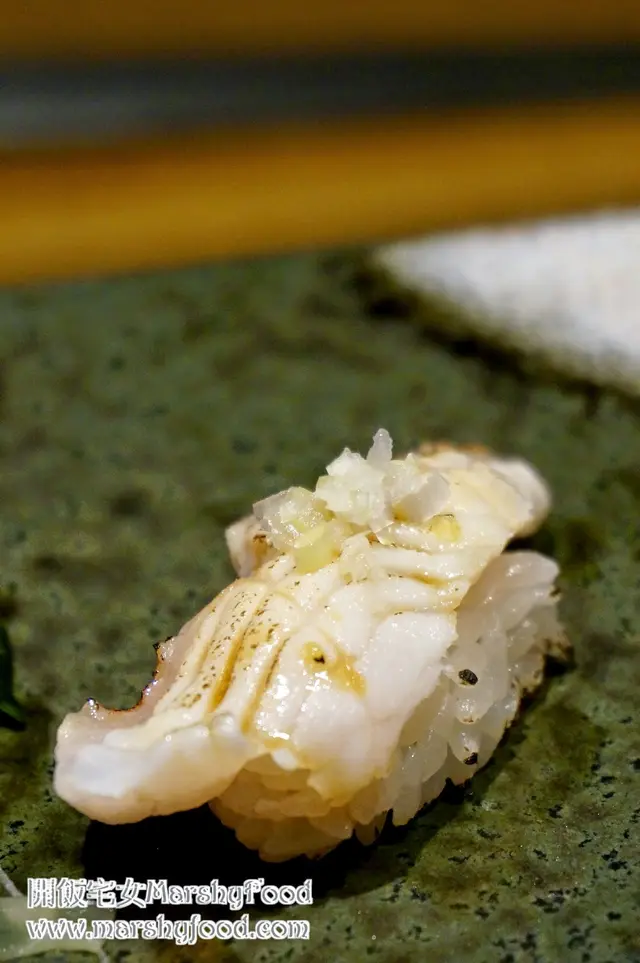一向接觸到的喜之次都是整條拿來燒, 美味度不用多說, 單是平常一條都要動輒過千便知道有多珍貴. 這裡用了來做壽司, 同樣輕輕的炙燒過, 魚肉意想不到的非常有彈性, 油脂豐富得來又不會過於肥膩, 突然好想燒一條來吃啊......