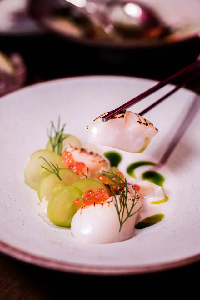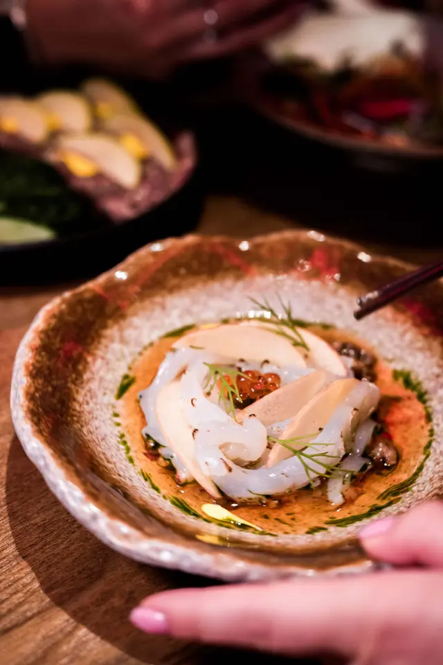 魷魚刺身搭配黃皮果和酸梅柚子醋,質感爽口,帶點草本清香。
