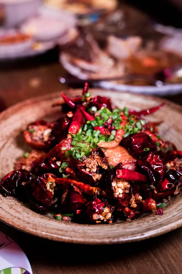 蜜糖麻辣雞翼炒上乾辣椒和花椒,甜辣並存,外層香脆。