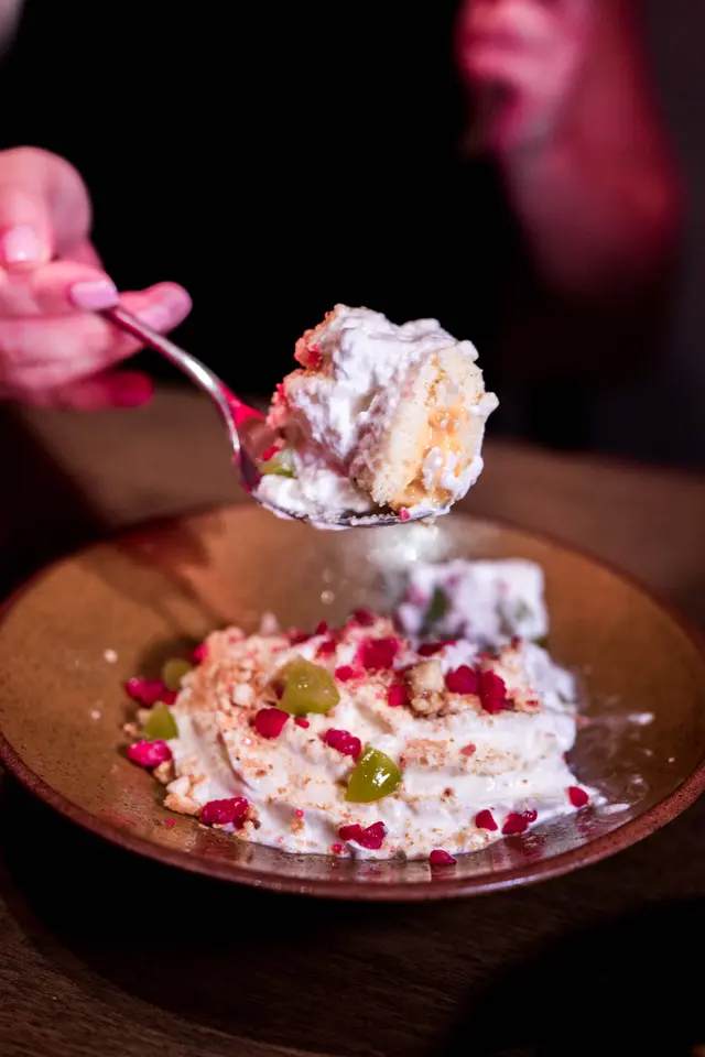 芒果蛋奶凍伴乳酪忌廉,加入椰絲和焦糖榛子,果香清爽,層次較輕盈。