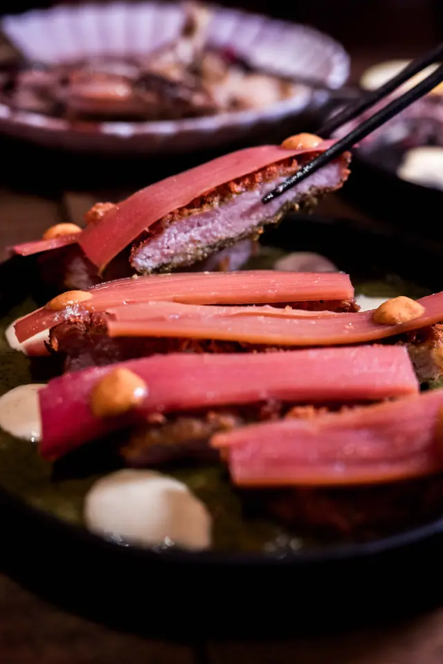 黃金吉列脆豬扒炸得酥香,伴上醃紅莧、煙燻車厘茄醬及芥末沙律醬,帶酸甜與辛香。