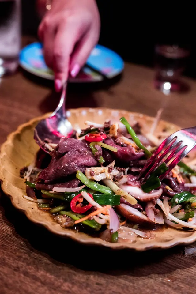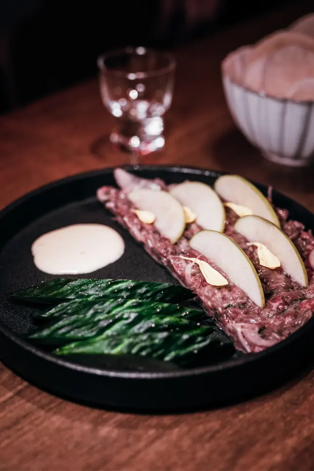 越式和牛他他以生牛肉配蛋黃,伴上蝦片食用,酸汁帶點韓式風格。