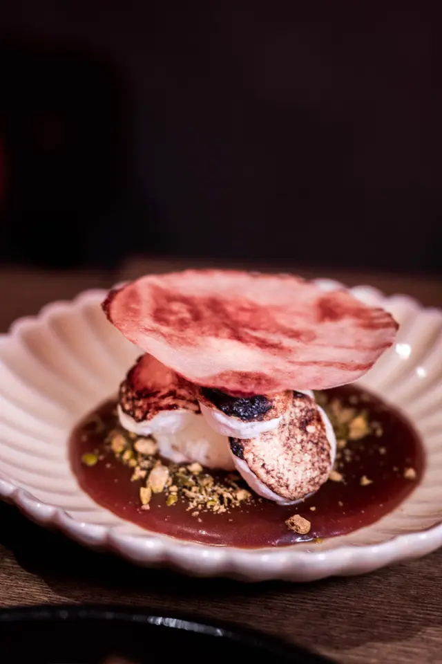 甜品焦香白蘭地配雲呢拿雪糕,帶海鹽焦糖鹹香還有焦糖化的棉花糖,甜中帶酒香。