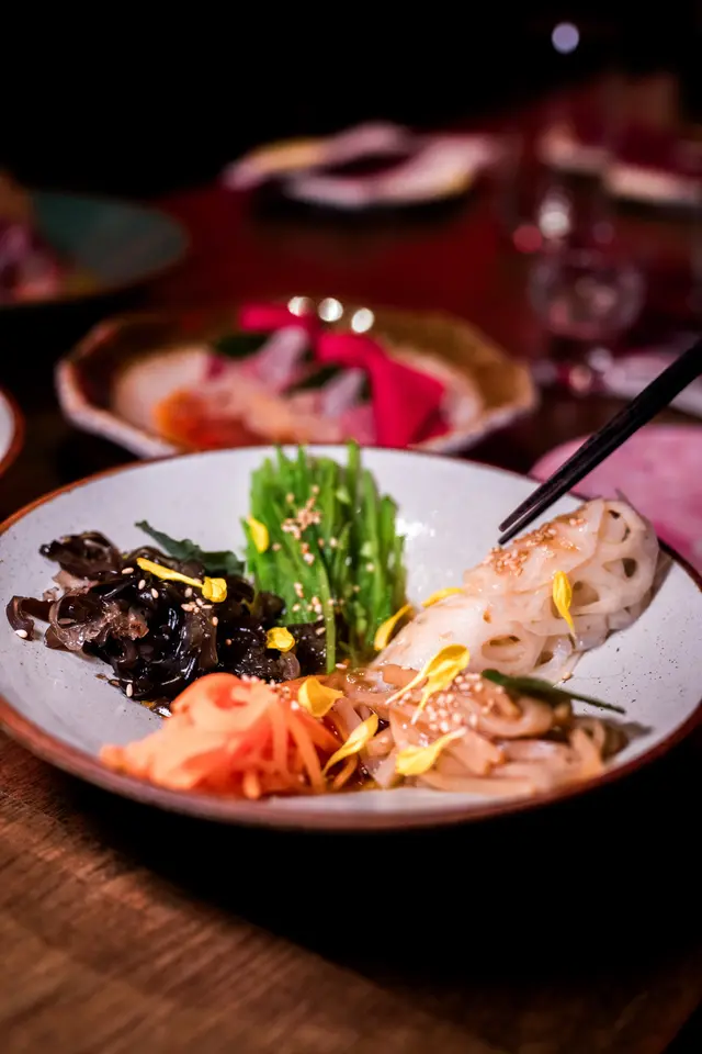 韓式撈起以筍片及時令蔬菜組成,配上薑豉油汁,爽脆清新,味道簡單直接。
