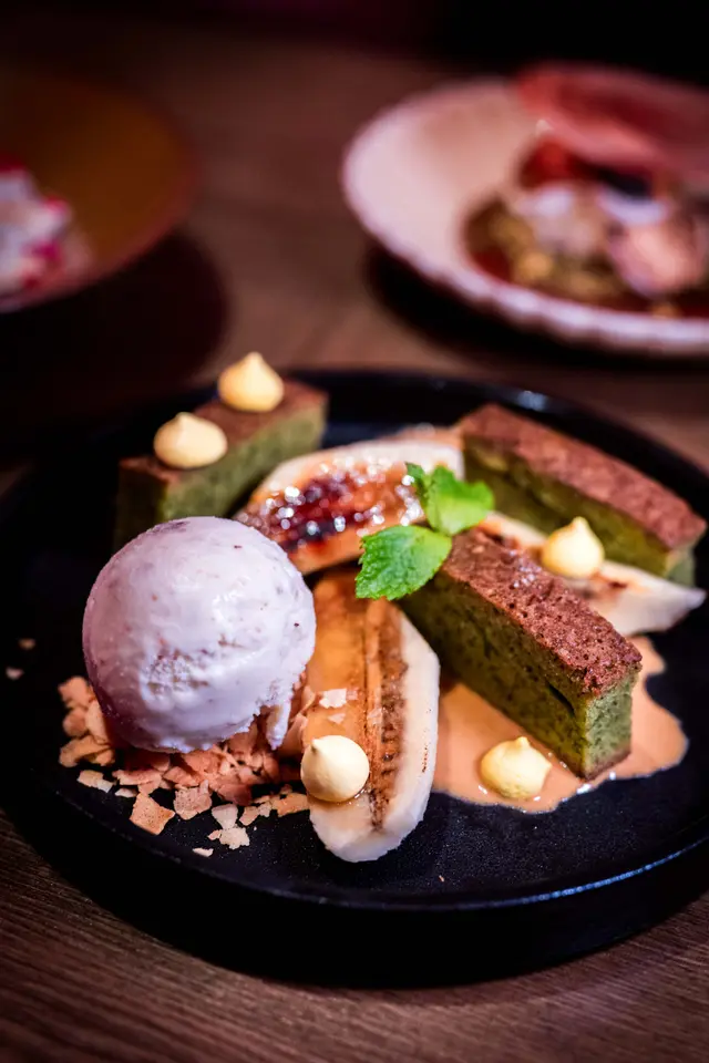 泰式奶茶蛋糕帶茶香,伴冧酒提子雪糕和焦糖香蕉,很不錯。