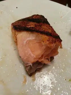 上菜了!烤魚的魚是三文魚,魚的表面烤得有點燶,但內裏是剛剛好的。尤其是中心部分烤得非常嫩滑。