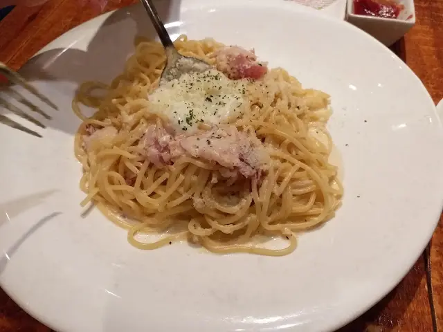 溫泉蛋芝士卡邦尼意粉,$88,免費加大1.5倍,份量真的很多。卡邦尼,正常味道;芝士味很平衡,溫泉蛋加在意份上,生蛋在卡邦尼意粉亦十分重要。不喜歡吃生蛋的,也可以拿走。