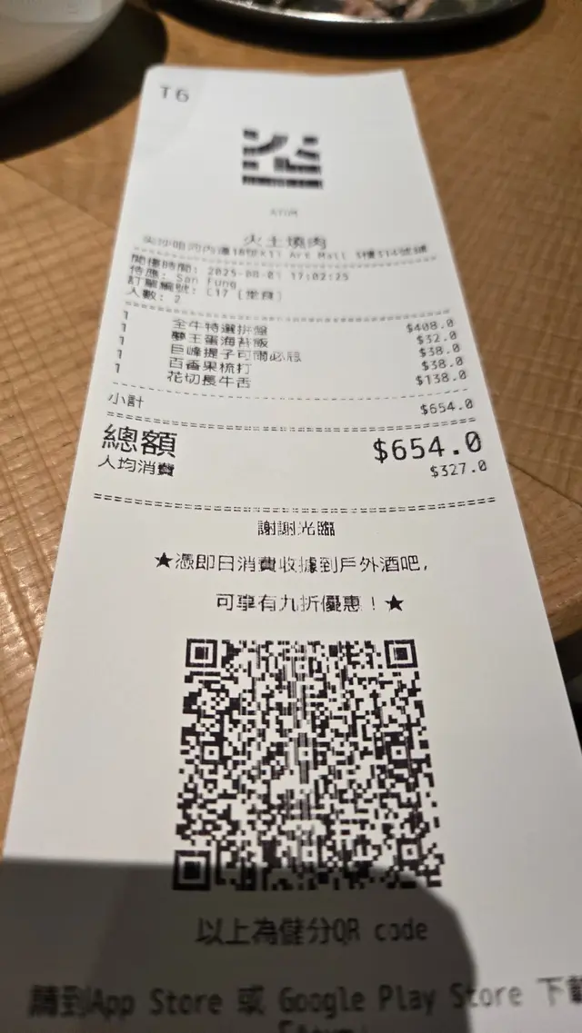值得一提,埋單金額為 $654(二人),以尖沙咀地段與食物質素計,絕對算得上性價比高。每位 $327 的消費,可以一次過體驗多款牛肉部位、小食與特飲,絕對物有所值。