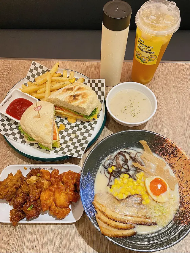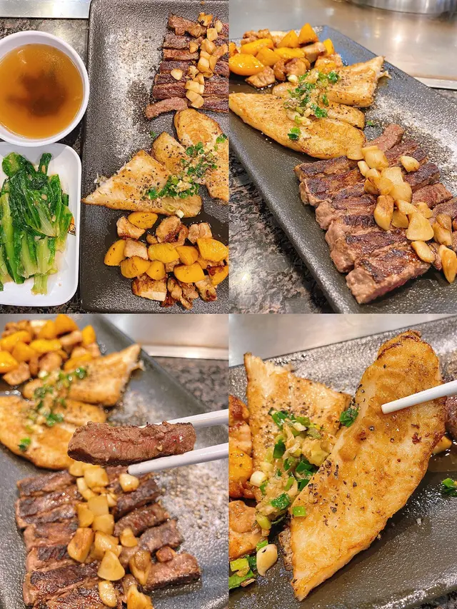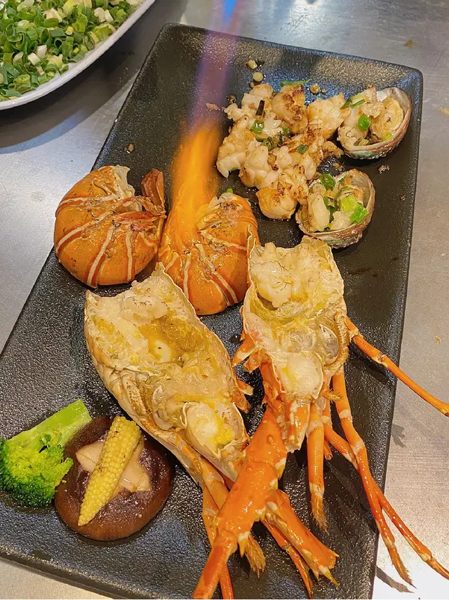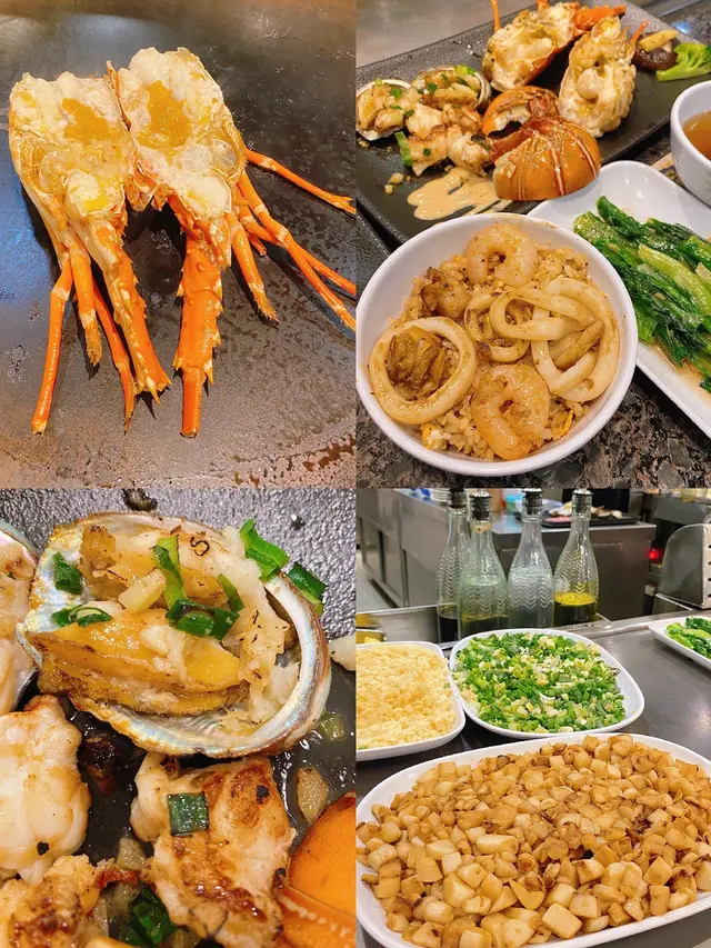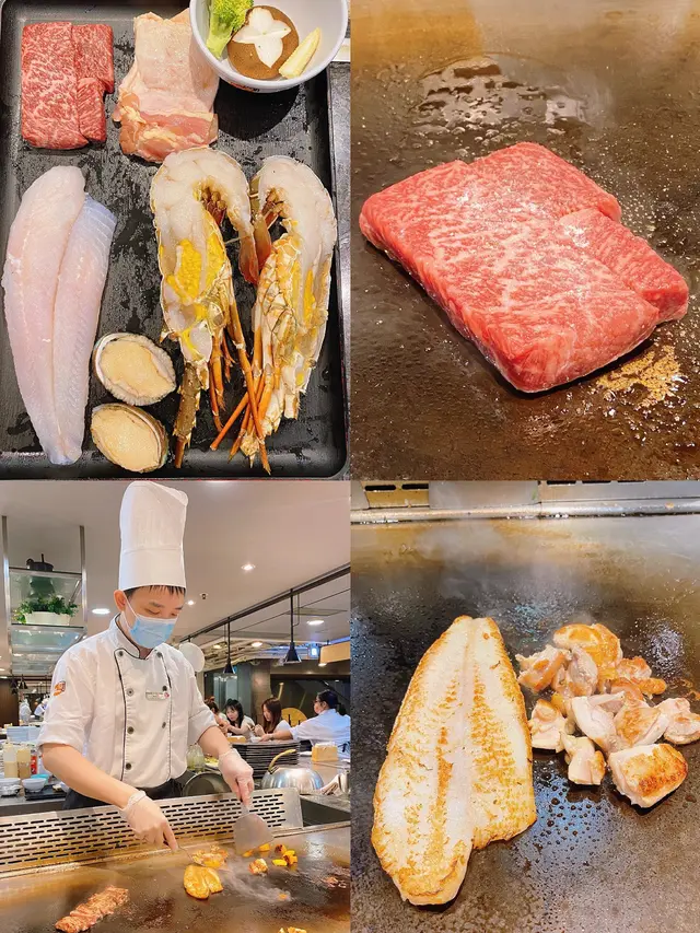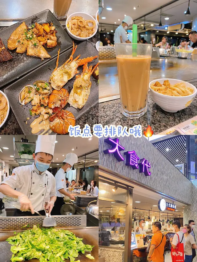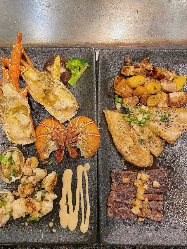 美食广场太多选择,直到看到这个豪华版套餐,完全走不动了!A5和牛配整只龙虾,鸡扒/龙利鱼/鲍·鱼,海陆空全整齐了。饭点全是人,三个铁板同时开工🔥师傅的铁板烧功力相当了得,炒的热气腾腾有滋有味!食材太新鲜了,现做现烧,和牛相当惊艳火候控制的很好,龙虾鲍鱼肉质弹牙鲜甜,用黄桃炒鸡还是首次吃,桃子的甜味全部挥发在鸡肉里,再来蔬菜和汤压一压吃完不怕上火了。自选海鲜/和牛炒饭,我的海鲜炒饭料太足,铺满虾仁扇贝和鱿鱼🦑附赠饮品,台式奶茶太好喝啦🥤