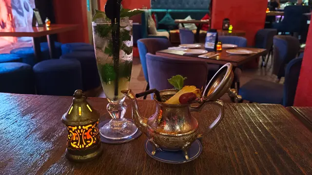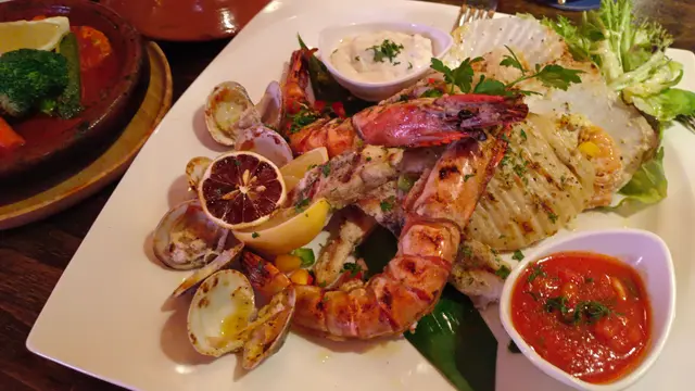 餐廳以磚紅色為主調,搭配中東風的彩燈和裝飾,環境既開揚又帶點異國情調。室內座位舒適,戶外區域則能感受到海旁微風,特別適合晚上來放鬆一下。空間不算太大,但桌椅間距恰好,坐著不會覺得擠。靠海的位子能看到將軍澳海濱的景色,雖然不是維港級別,但吃飯時有這點風景,還是挺加分的。食物方面,SeaRock Lounge的地中海菜做得用心,味道正宗又不失親切。點了雞肉串燒,雞肉嫩滑,醃製的香料味濃,搭配酸奶醬和pita麵包,口感豐富。鷹嘴豆泥是另一亮點,質地細滑,橄欖油和芝麻醬的香氣很開胃,配上烤得微脆的麵包,簡單卻滿足。試了雜堅果飯,米飯混入提子乾和杏仁片,帶點甜味,與羊肉塔吉鍋搭配,味道更上一層樓。