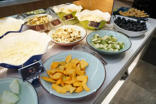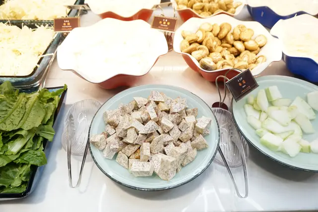 而野菜區選擇更是豐富,有日本大蔥、娃娃菜、油麥菜、金菇、蕃茄、白蘿蔔、大菇、粟米、南瓜、蓮藕等,跟甜美的壽喜燒是絕配。熟食區有前菜、卷物、素翅、咖哩飯,不過當然是乏人問津吧!