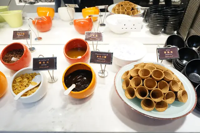 甜品區卻是甚有睇頭,竟有中式糖水供應,也有自製棉花糖、奶凍布丁、抹茶雪糕、椰汁黑糯米、和果子等。飲品置放在大型雪櫃,汽水以韓系為主、也有啤酒、熱飲供應。