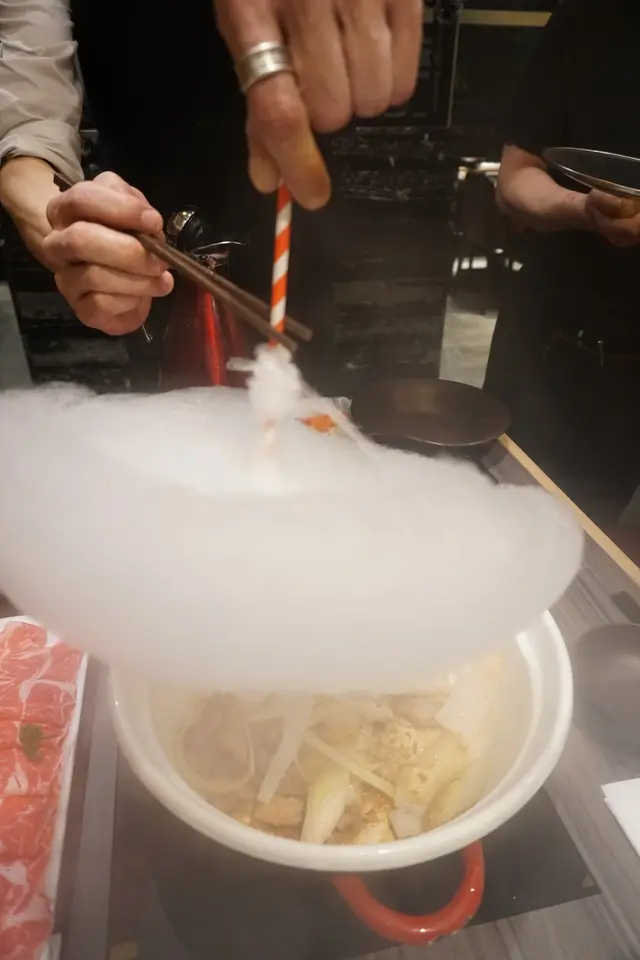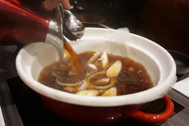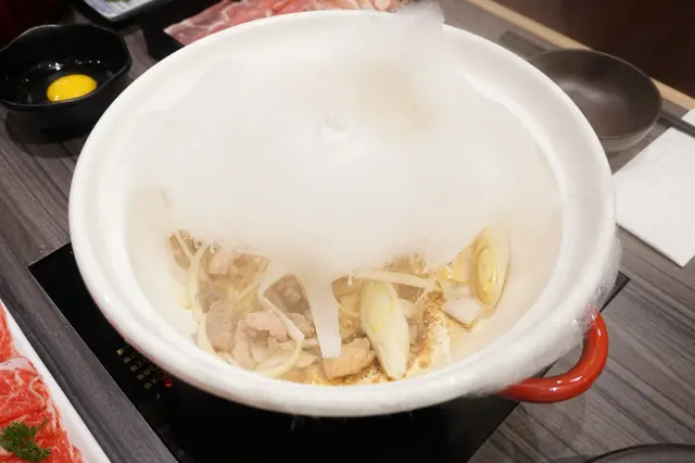 這棉花糖壽喜燒很受歡迎,看來嗜甜的食客為數不少。侍應先用牛脂起鍋,並加入香炒洋蔥,再倒入壽喜燒湯汁,待煮開後把綿花糖倒放於湯中,綿花糖瞬間融化,膩甜的綿花糖壽喜燒便告完成。