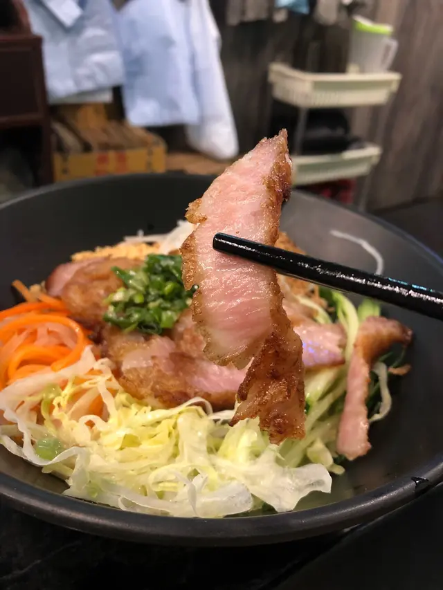 然後就係主菜啦,緊係唔少得檬粉啦!開頭先講完想食,就當然要叫番一碗嘆下。今次就叫左香燒豬頸肉撈檬,睇張圖都知佢又係極多菜,生菜、青瓜、蘿蔔,成件事好健康,可以中和番食豬排同豬頸肉既罪惡感哈哈。成碗野加埋魚露,又涼又酸甜咁,真係好消暑!