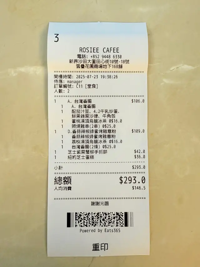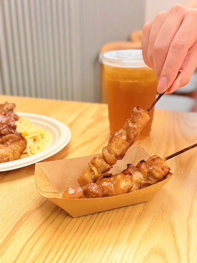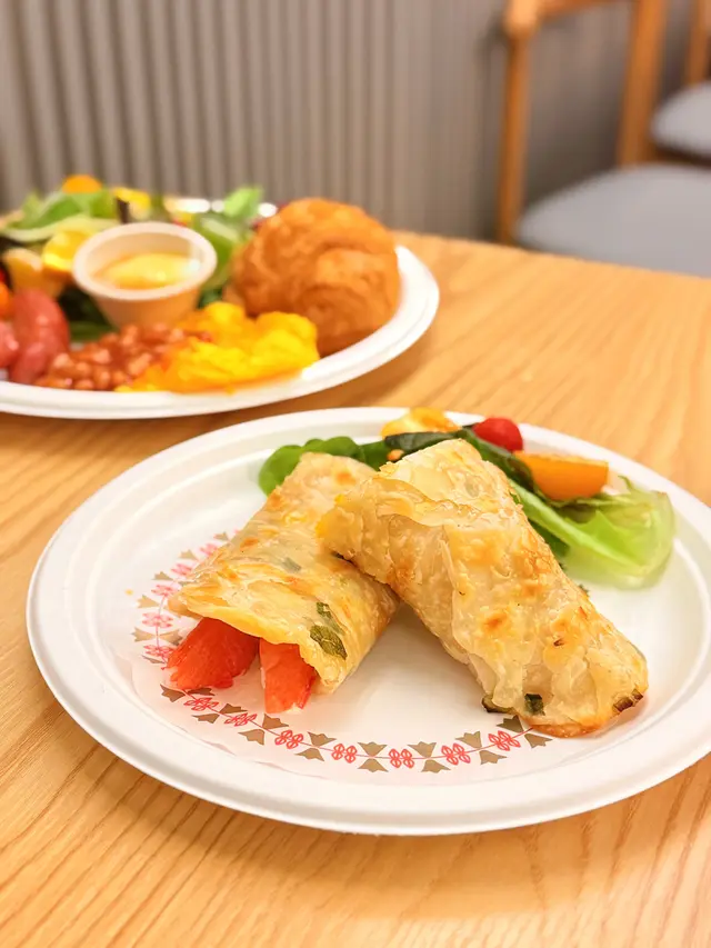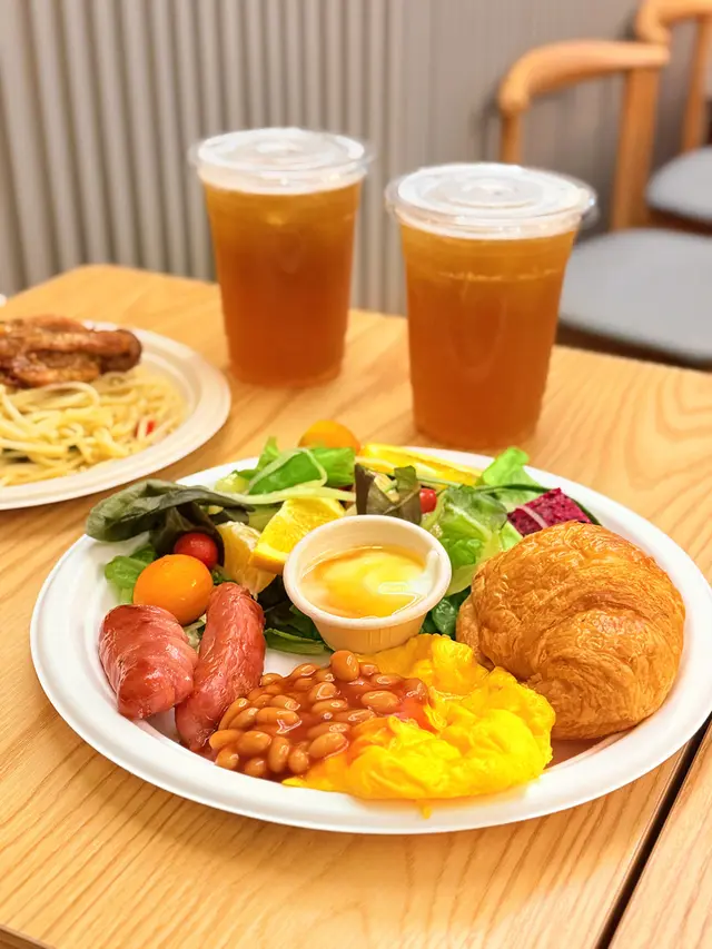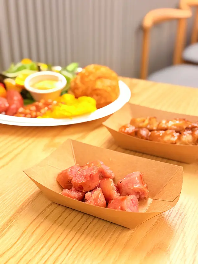 平時喺出面食all day breakfast閒閒哋都要$100以上,呢度真系賣得勁平😳揀咗台灣香腸,配新鮮水果雜菜沙律,蜂蜜乳酪,茄汁豆,4.2半乳炒滑蛋,牛角包。台灣香腸鹹香十足,紅火龍果好健康🩷茄汁豆好入味❤️牛角包鬆脆🥐另外有照燒雞串,雞肉嫩滑而且入味。