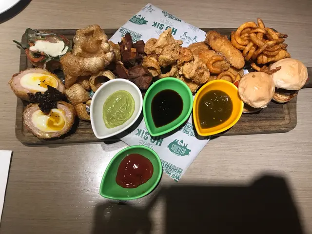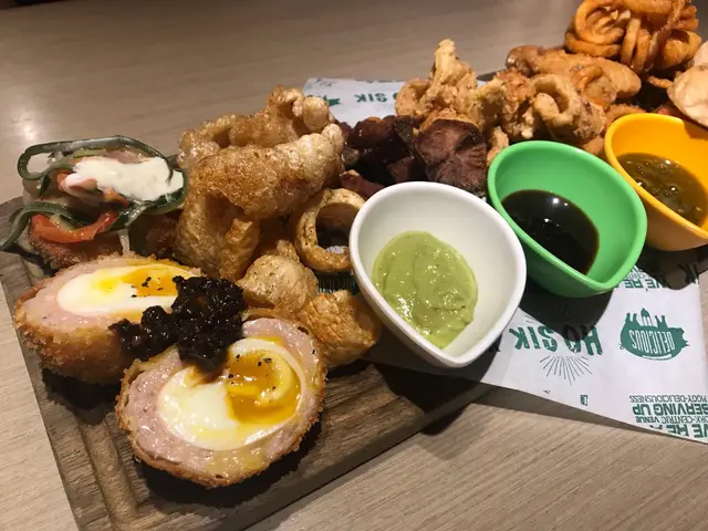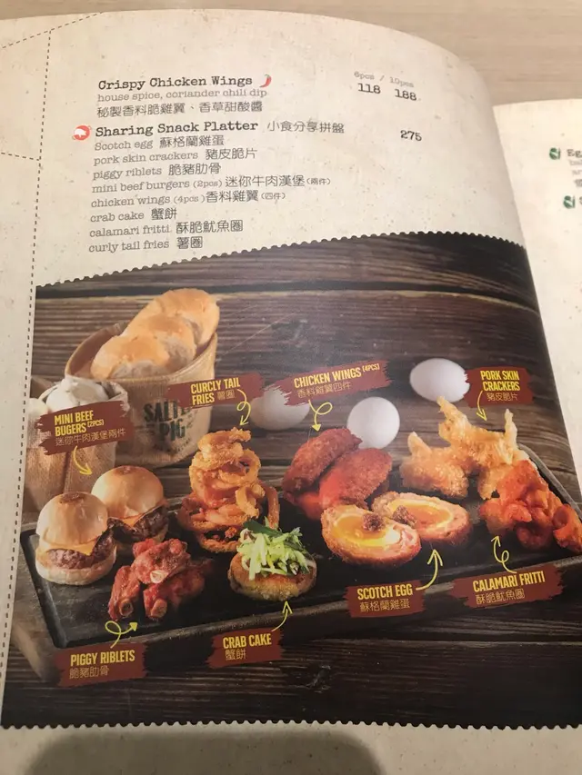 有蘇格蘭糖心蛋、炸豬皮、脆豬肋骨、迷你牛肉漢堡、炸雞翼、蟹餅、魷魚圈及薯圈。