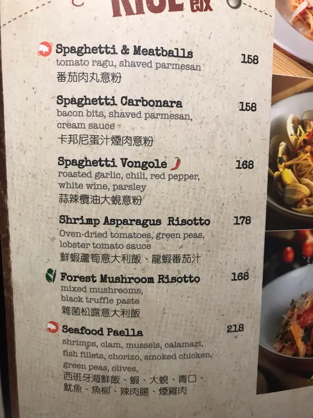 典型西餐的餐牌,有前菜、小食、意粉、燴飯、少量甜品和一些酒精類的飲品。