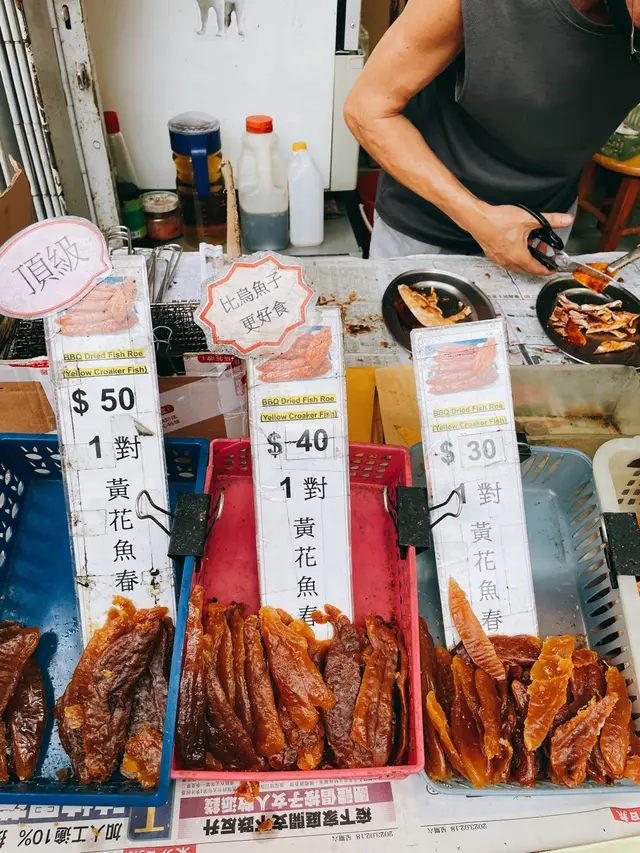排隊時剛好見到其他人買賴尿蝦乾,那種香濃的蝦香,聞起來獨具誘惑。起初抱著留肚到其他檔攤的心情,買完黃花魚魚春後便離開了。後來回程時再次經過,還是受不了引誘,二刷排隊光顧。