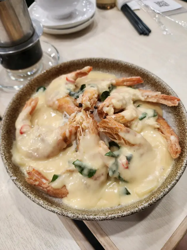 睇餐牌期間侍應推薦既馬來奶油蝦:一碟有八隻,隻隻都幾大下,整到蝦肉算爽唔痴殼,個殼又趣口,我成隻連殼食,連個頭都比我碎埋。汁有奶油香味配埋粉絲撈黎食,唔錯