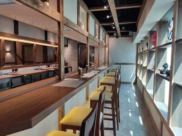 長方形嘅店面,食客都係圍全中間嘅廚房而坐,換句話講,每個座位都可以睇倒師傅表演。
