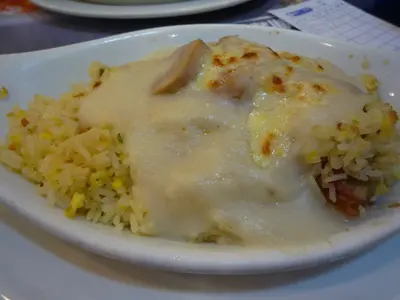 論到"港式焗飯",這兒都應該算是其一表表者。至於何謂"港式焗飯" ? 對小弟而言,就是將不同 (有許多更是九唔搭八的combination)的材料放在一起,繼而舖在飯或意粉上,最後加上芝士放入焗爐焗一下子便可奉客。以小弟之愚見,用這些東西來填飽肚當然是游刃有餘,但要稱之為美食,還是差得很遠呢....