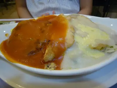 看看太太的那個"芝士焗石班豬柳漢堡焗飯",面層的芝士是還沒有焗得焦香的,好像是臨奉客之前才將那pat"芝士獻"求其舖上去似的所謂的"石斑肉"及漢堡當然是frozen food,入口仍殘留着少許雪味,就連那厚厚的醬汁也掩蓋不了;飯底也沒怎預先炒過,不夠香;那個"紅白"獻汁就更不用說了,杰得有如漿糊一般,是全然膠着喉嚨的,怎吃得下口 ?....