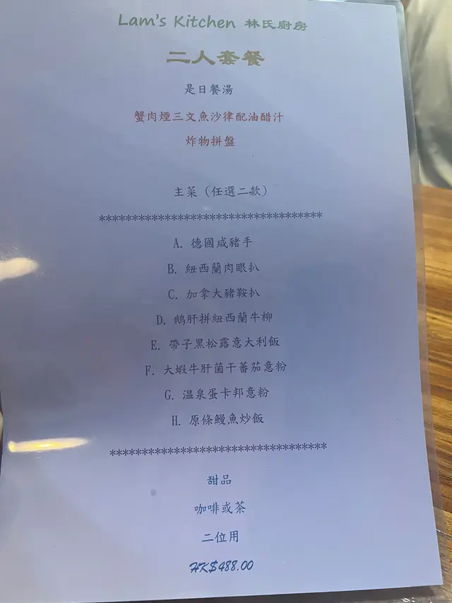 佢哋有一個二人套餐只係$488,真係好抵食😉套餐包括餐湯、蟹肉煙三文魚沙律🥗配油醋汁、炸物拼盤同自選主菜兩款。最後仲有甜品同埋咖啡或茶可以揀。