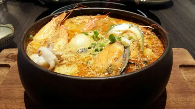 冒着白煙的冬蔭公盛於石鍋中保持熱度