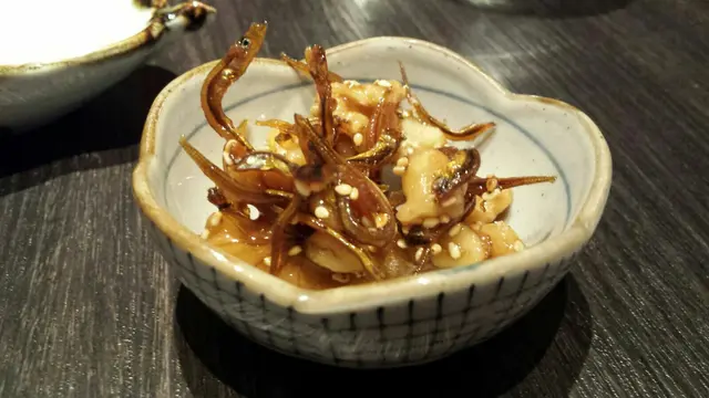 點餐後服務生馬上端上是日前菜,是一小碟琥珀合桃小魚乾。三顆香脆飽滿的合桃仁沾滿甜而不膩的蜜糖漿,加上有嚼勁的小魚乾增加口感,以及不少香氣十足的白芝麻,整碟前菜都令人回味無窮,令人十分期待接下來的主菜