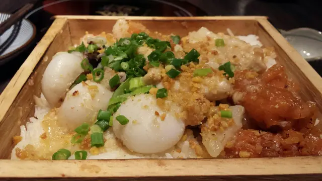 服務生端來一個精緻典雅的大木盒,一打開盡是熱騰騰的白飯及滿滿的蔥蒜蒸海鮮