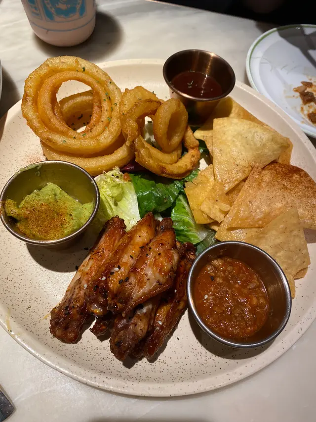 然後就到拼盤啦——有洋蔥圈、雞翼、玉米片同醬汁,仲有啲沙律,啱晒咩都有啲想試下嘅人。洋蔥圈炸到金黃脆卜卜,雞翼唔會太油膩,咸香惹味,玉米片配埋guacamole同salsa都夠晒正宗,好有層次感。