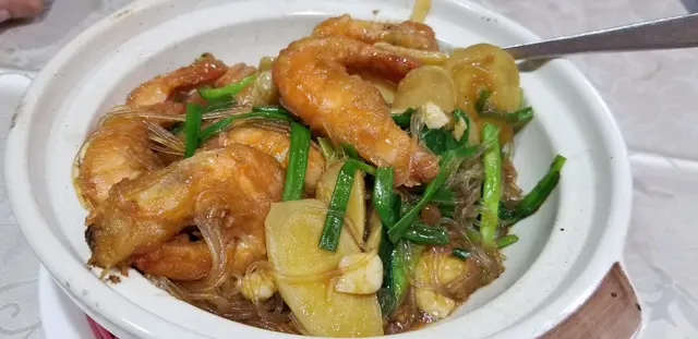 「香蔥粉絲海蝦煲」 : 香蔥配菜既份量算多,非常吸味, 如果粉絲既份量都可以略為多一點應該會更完美,另外,海蝦既份量好足亦算新鮮,不過老實講就唔太入味,如果豉油既味道可以濃味一點會更好。