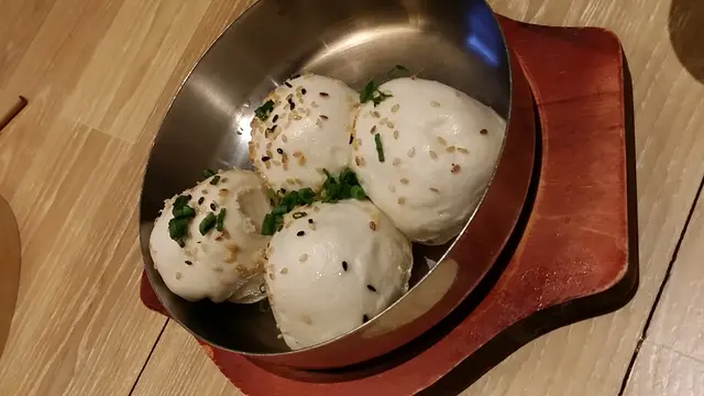 生煎包用了銀色平鍋煎脆後連鍋一同盛上, 湯汁比小籠包的更重肉味及鮮甜也更多,不過餡肥肉比重高, 顧及脂肪吸收我就只吸啜內裡的湯汁, 享用時別心急, 小口咬開包皮避免湯汁四射。包底煎到脆口呈金黃色而不油, 味道有點似炸窩巴但密度高。而上面的蒸包, 薄得只有0.5cm左右, 富有彈性及空氣感, 鬆軟又像饅頭的甜。