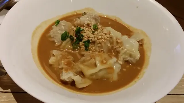 細細顆的豬肉雲吞一口剛好吃掉一粒, 豬肉肥佔4成瘦肉佔6成, 淋上很多花生醬把雲吞都淹沒, 再灑花生碎更添口感更風味, 濃郁深厚的花生醬, 雲吞皮薄又滑可以滑入喉嚨的程度,唯煮過久易爛久完整。