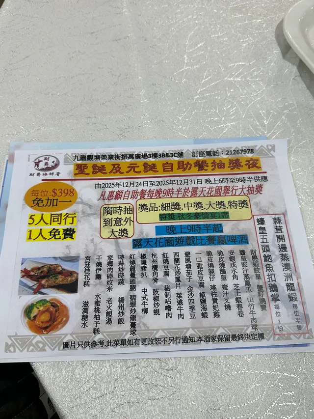 秋涼下班後,我們兩人就來到觀塘碼頭的海滂附近一間新開的中式酒樓吃晚餐,本來想叫小菜簡單吃一個晚餐,後來店家推介新推出的自助晚餐,在聖誕節及元旦時更會有大抽獎。既然如此,就順應其好意支持。