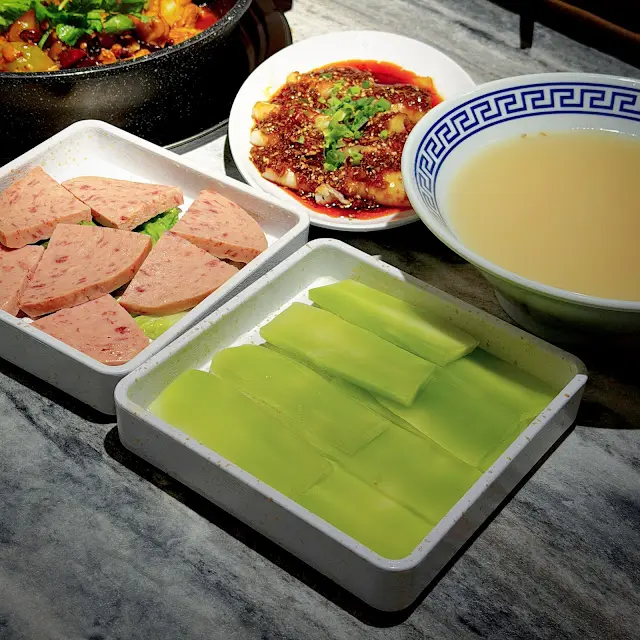 吃罷雞煲之後我們點了兩款火鍋配料繼續打邊爐!分別點上午餐肉$28和萵筍片$22,兩款也是麻辣火鍋的好朋友當然好吃。