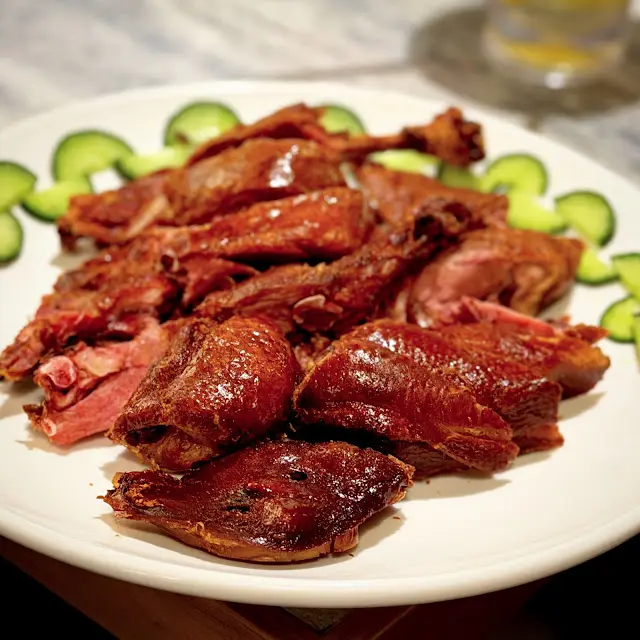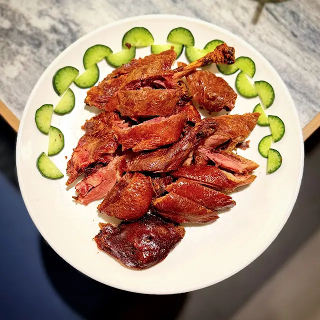 這隻樟茶鴨帶上幽幽的煙燻味道!但某些位置做得特別香脆少了多汁的咬口。