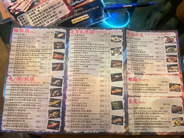 由不同種類的串燒,包括:時令海鮮🦐、牛肉🐮、豬雞🐷🐔、丸腸類、蔬菜瓜類🥬,除咗一啲串燒類別還有一些小食、主食和甜品🍮