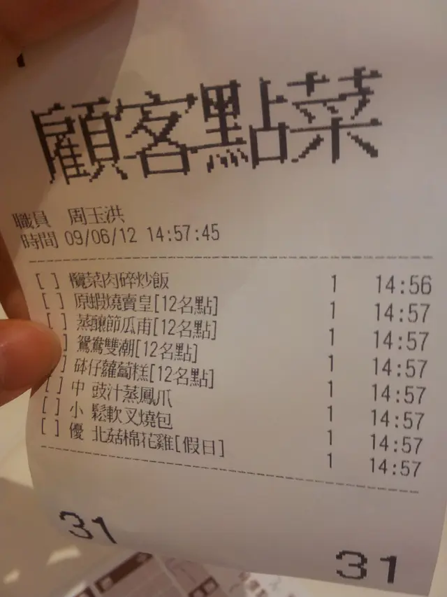 我地四大一小入去坐低一陣就叫點心,等左20分鐘一樣點心都未嚟,就覺得有點怪,跟住問下仕應,有一個仕應講唔咸唔淡廣東話去check電腦,話冇資料係電腦度,跟住又話已經入番,咁我地再等多一陣,點知又過左好幾個字,都冇一樣嘢嚟,我地再問另一個仕應,唔知點解佢又問番頭先幫我地跟的果個仕應,可能係佢負責我地呢邊卦,佢check都冇check就話入左啦!!!!!
