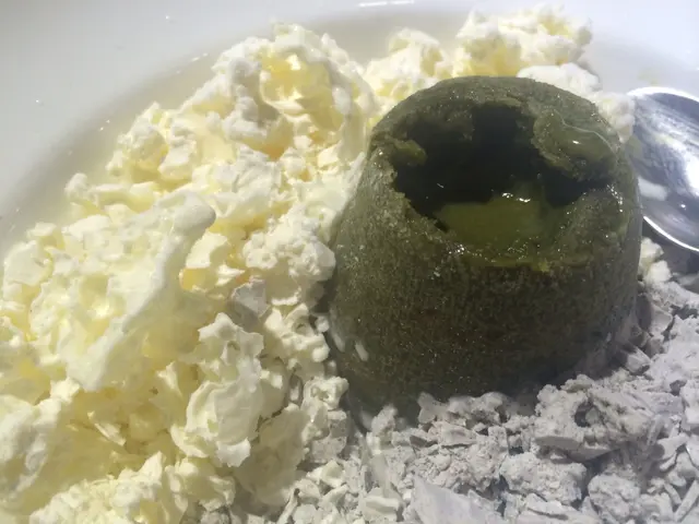 另一個心太軟就好有驚喜 一上枱氮氣還在 散出煙霧效果好美 雖然煙一散 啲雪芭同雪糕一舊舊咁 好似碎了的骨頭咁 但好有口感 芝麻好香 配上抹茶心太軟味道挺新鮮 雖然旁邊圍著凍品 但流心效果仍然好好 呢個甜品水準不錯 店員還會提你不要即刻食 要等一會才吃 因為要等佢溶一溶化 如果唔係會黏住嘴唇呢^^